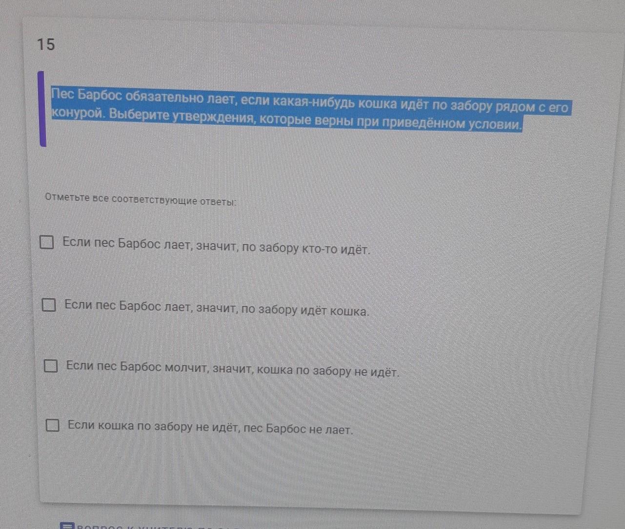2 , 3 . 1 Не правильное потому что нам об этом не сказано 4 Не правильное потому что может хоть человек проходить , барбос не будет лаять , но нам также как и в 1 задании об этом не сказано!
