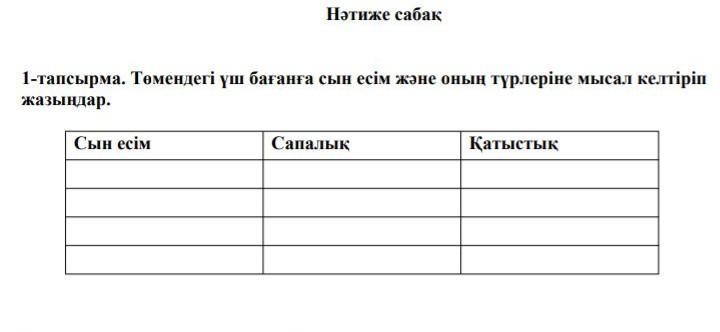 1 - тапсырма . Төмендегі үш бағанға сын есім және оның түрлеріне мысал келтіріп жазыңдар . Сын есім Сапалық Қатыстық