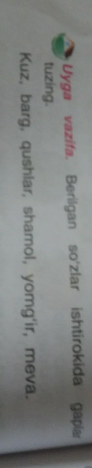 помогите пожалуйста срочно нужна узбекский язык 4 класс домашняя работа uyga vazifa. berilgan so‘zlar ishtirokida gaplar tuzing.Kuz,barg,qushlar,shamol,yomg‘ir,meva.