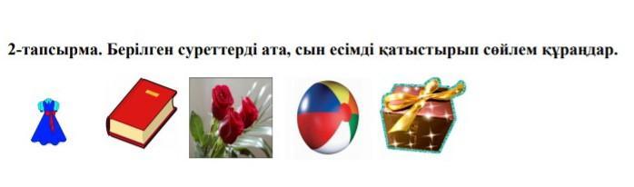 Тапсырма 2. Суреттерді ата және сын есіммен сөйлем құра.