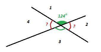 Смежный угол с углом 124° равен 180-124=56° при пересечении двух прямых получаются вертикальные углы, а они равны, значит 2 угла по 124° и 2 угла по 56°.