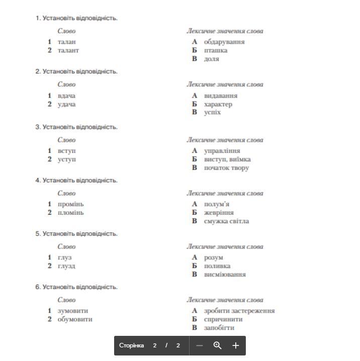 Відповідь: 1) 1В 2А 2) 1Б 2В 3) 1В 2Б 4) 1В 2А 5) 1В 2А 6) 1Б 2В