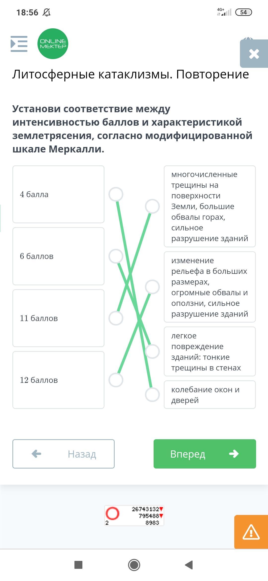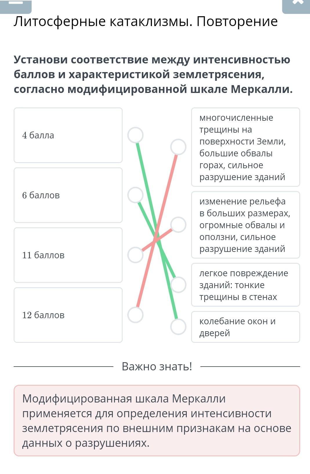 Установи соответствие между интенсивностью баллов и характеристикой землетрясения, согласно модифицированной шкале Меркалли.