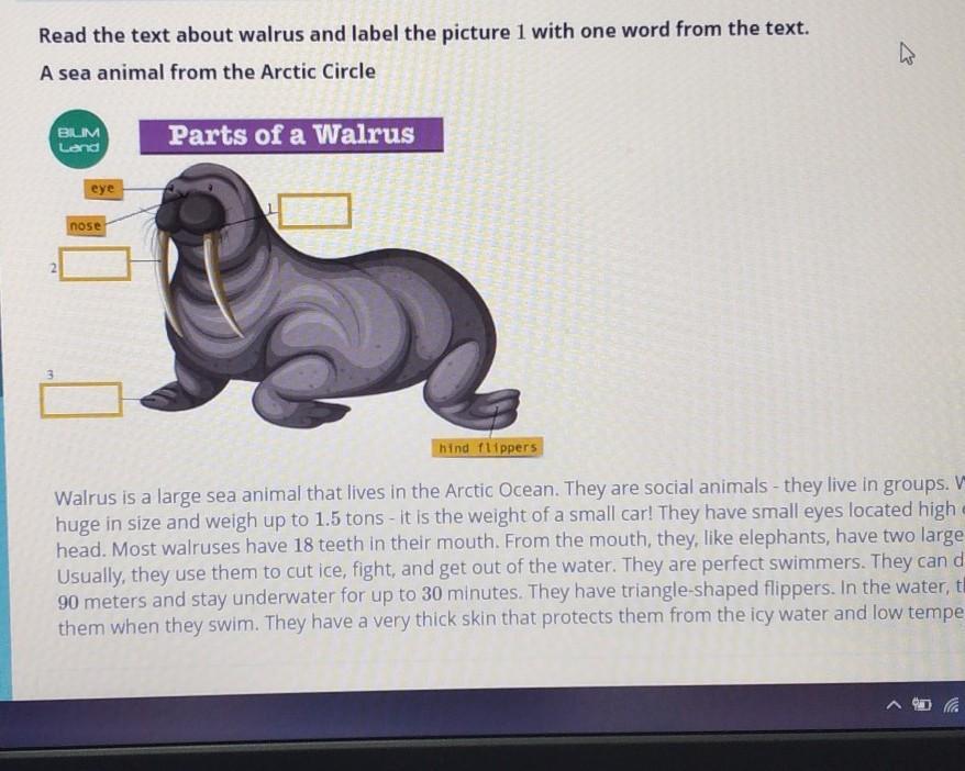 Read the text about walrus and label the picture 1 with one word from the text.