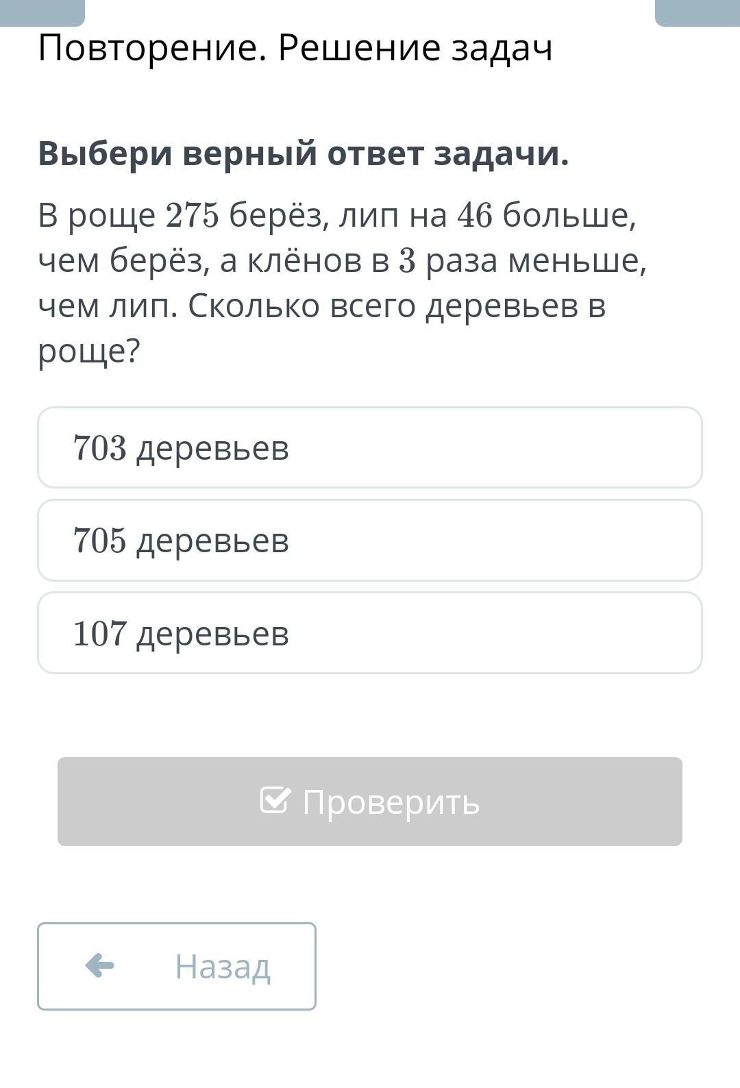 в роще 275 берез лип на 46 больше чем берез а кленов в 3 раза меньше чем лип сколько всего деревьев в роще