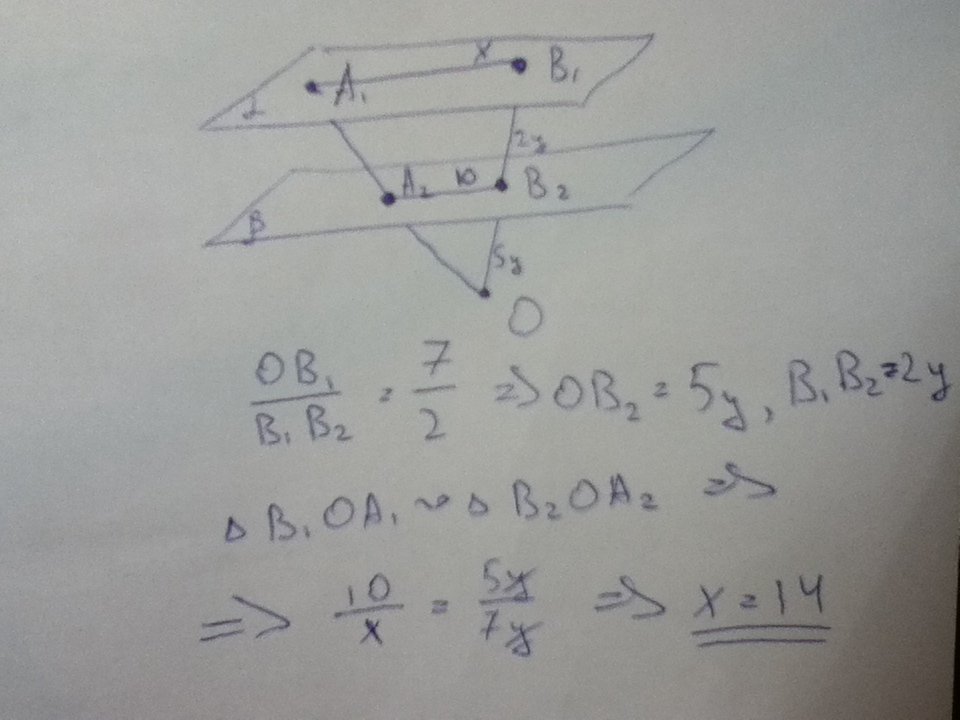 Через точку O, не лежащую между параллельными плоскостями альфа и бета, проведены прямые l и m. Прямая l пересекает плоскости альфа и бета в точках A1 и A2 соответственно, прямая m плоскость альфа и бета в точках B1 и B2. Найдите длину отрезка A1B1, если A2B2 = 10 cм.
