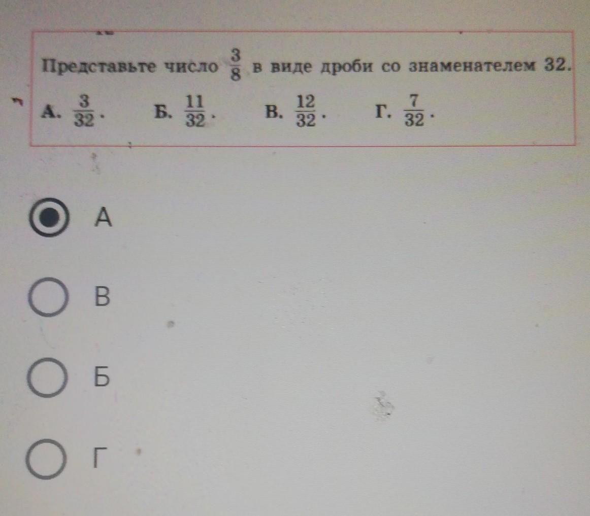 12/32 , так как чтобы представить число 3/8 со знаменателем нужно умножить данную дробь на 4