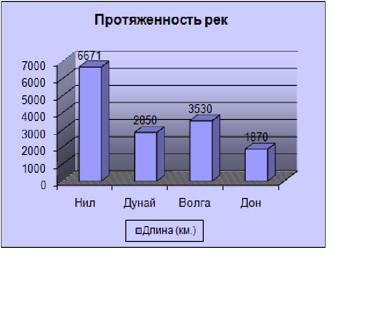 Представьте следующую информацию в наиболее наглядной с вашей точки зрения форме: длина Нила-6671км, Дуная 2850км, Волги-3530км, Дона-1870км.