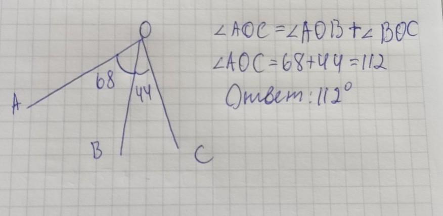 Луч OB делит угол AOC на 2 угла. Найди угол AOC, если угол BOC = 44 градусам, а угол AOB = 68 градусам