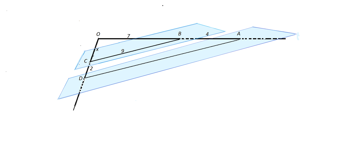 Дан угол AOD и две параллельные плоскости α и β. Плоскость α пересекает стороны угла OA и OD соответственно в точках A и D, плоскость β эти стороны пересекает соответственно в точках B и C. Дано: OB = 7 AB = 4 BC = 9 CD = 2