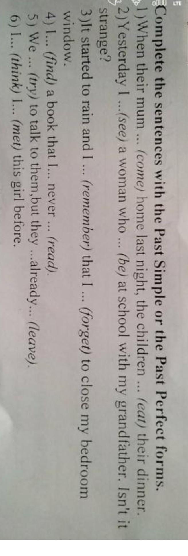Complete the sentences with the Past Simple or the Past Perfect forms. 1)When their mum ... 2)Yesterday I ...(see) a woman who... (be) at school with my grandfather. Isn't it strange? 3)lt started to rain and I ... (remember) that I... (forget) to close (come) home last night, the children... (eat) their dinner. my bedroom window. 4) I... (find) a book that I... never ... 5) We ... (try) to talk to them,but they ...already... (leave). 6) I... (think) I.. (met) this girl before. (read).