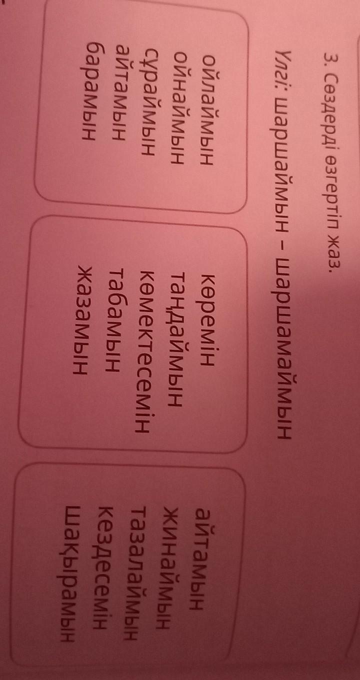 Ответ: ойлаймын-ойламаймын, ойнаймын-ойнамаймын, сұраймын-сұрамаймын, айтамын айтпаймын, барамын-бармаймын, көремін-көрмеймін, таңдаймын-таңдамаймын, көмектесемін-көмектеспеймін,табамын-таппаймын, жазамын жазбаймын, айтамын-айтпаймын, жинаймын-жинамаймын, тазалаймын-тазаламаймын, кездесемін-кездеспеймін, шақырамын*шақырмаймын