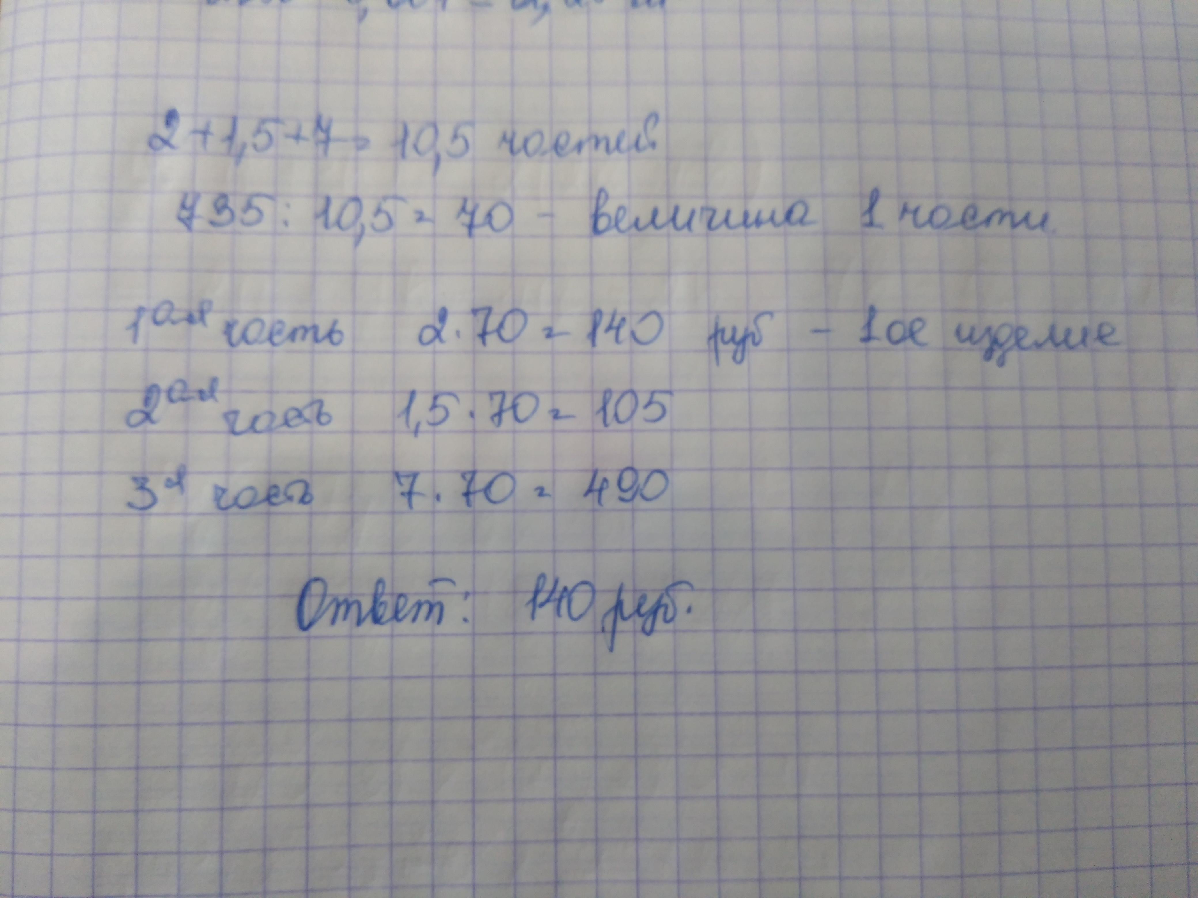 Стоимости 3х изделий относятся как 2:1, 5:7. Общая стоимость составляет 735 руб. Сколько руб. Стоит первое изделие.