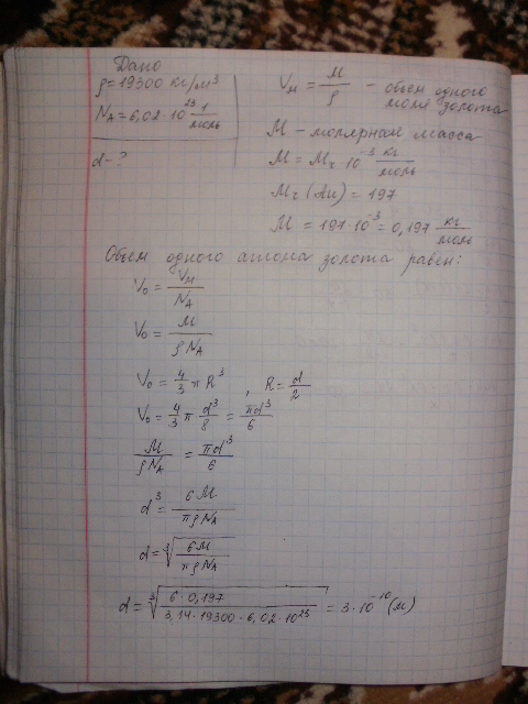 Зная плотность золота 19 300 кг/м^3 надо найти диаметр атома золота