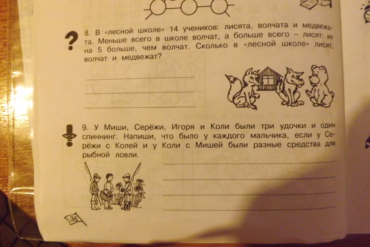 9 задание на странице 36: у Коли был спининг а у остальных удочки.