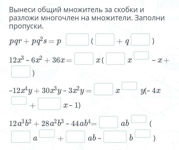 Вынеси общий множитель за скобки и разложи многочлен на множители. Заполни пропуски.