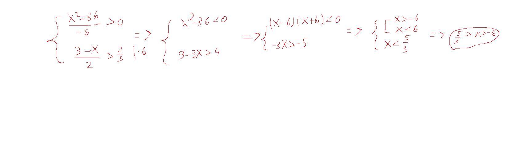 Первое неравенство будет больше ноля в том случае, если числитель будет меньше ноля, поэтому достаточно решить неравенство (x-6)(x+6)<0