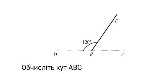 Угол DBC составляет 120 градусов. Угол DBA составляет 180 градусов. Вычитаем из угла DBA угол DBC.Получаем 60 градусов. Соответственно угол ABC составляет 60 градусов