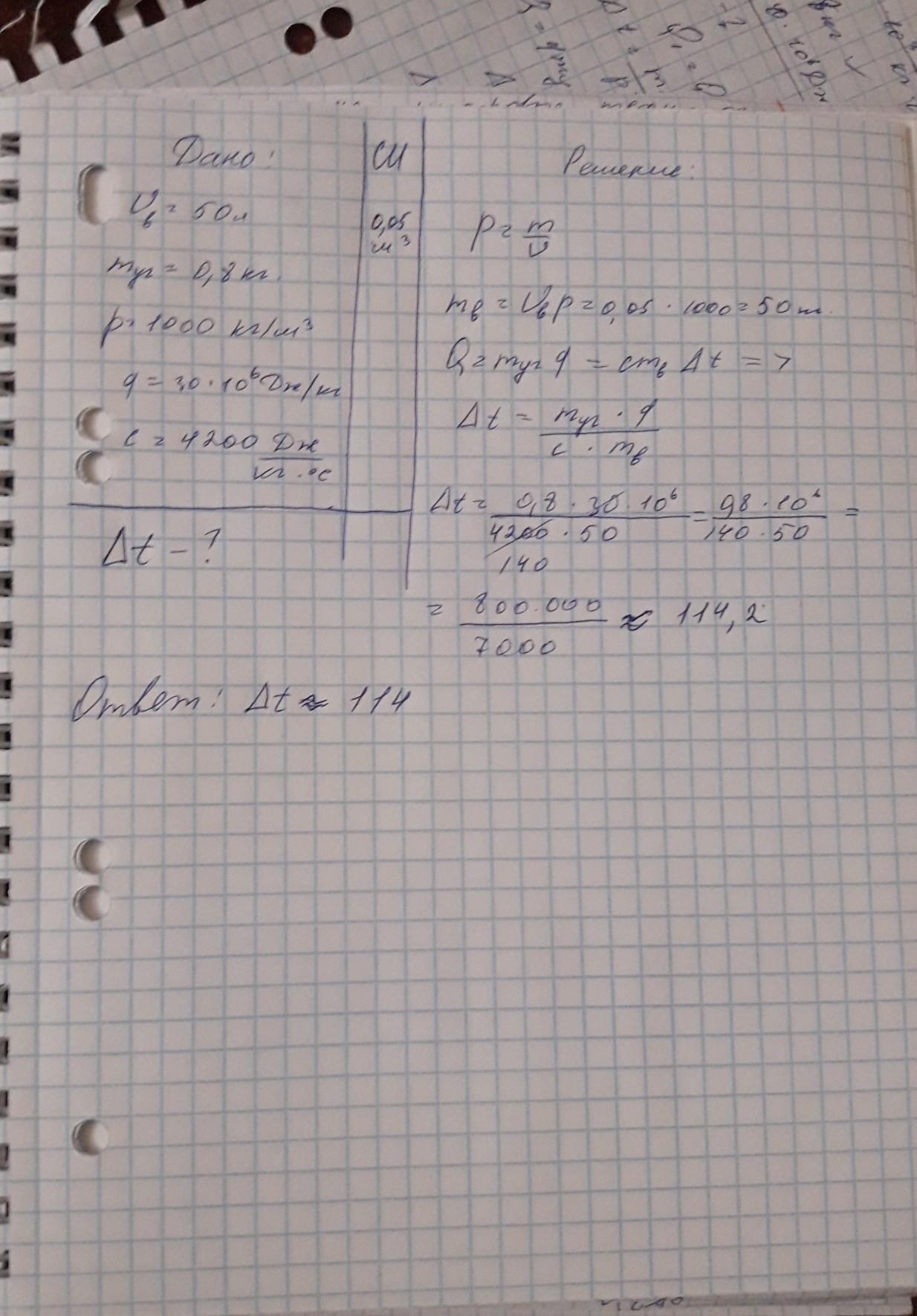 3. На сколько изменится температура воды объемом 50 л, если считать, что вся теплота, выделяемая при сжигании древесного угля массой 0,8 кг, пойдет на нагревание воды? (плотность воды g = 1000 кг / м ^ 3)