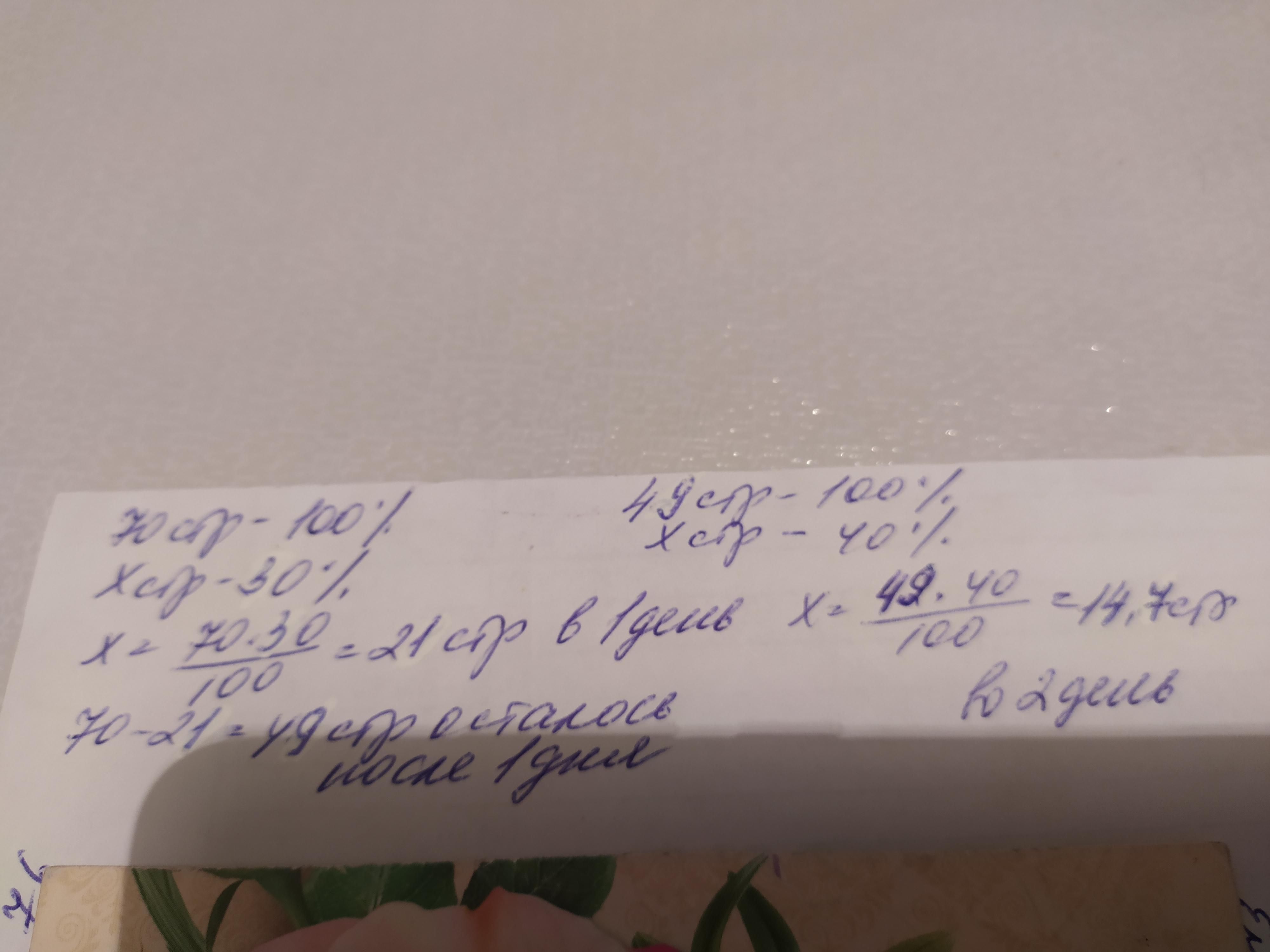 в книге 70 страниц в первый день ученик прочитал 30% книги во второй день 40% оставшихся страниц Сколько страниц ему осталось прочитать?Решить с помощью пропорции