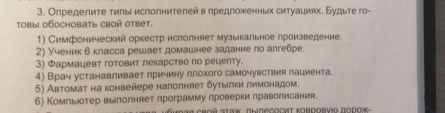 Исполнители бывают двух типов: формальные (выполняют действия не понимая смысла работы) и неформальные (понимают то, что делают и могут изменить действия в алгоритме)