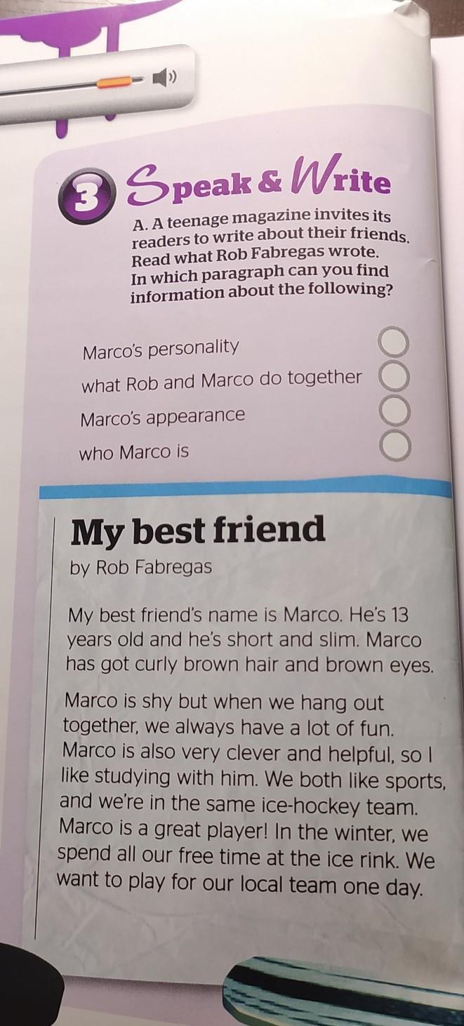 Marco's personality (2 параграф): Marco is shy, also very clever and helpful (Марко стеснительный, также очень умный и любит помогать)