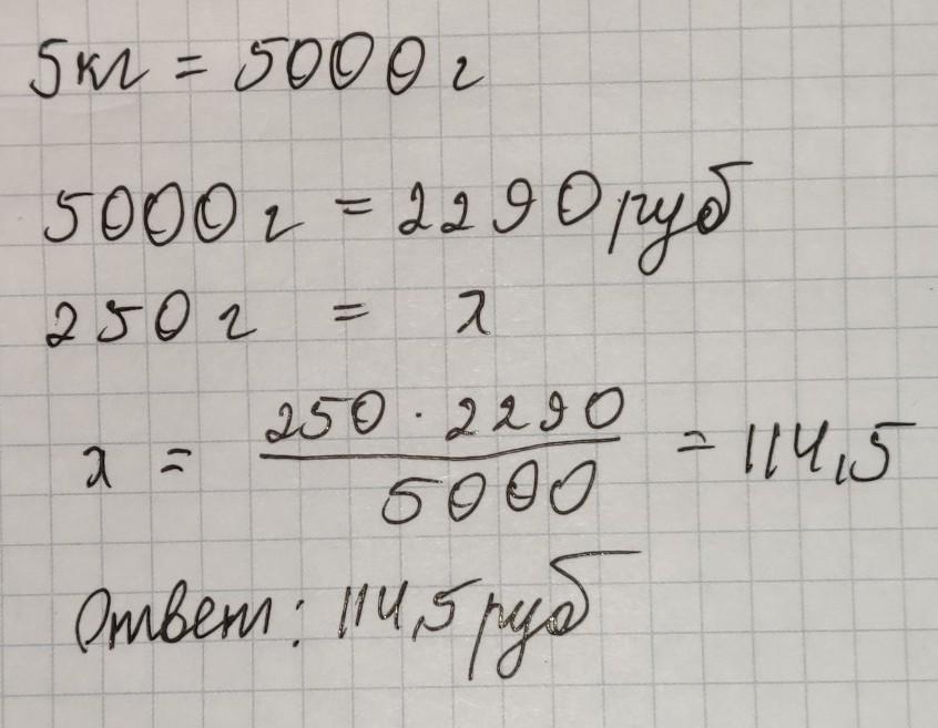 1) 2290 : 5 = 458 (руб.) - цена за 1 кг;