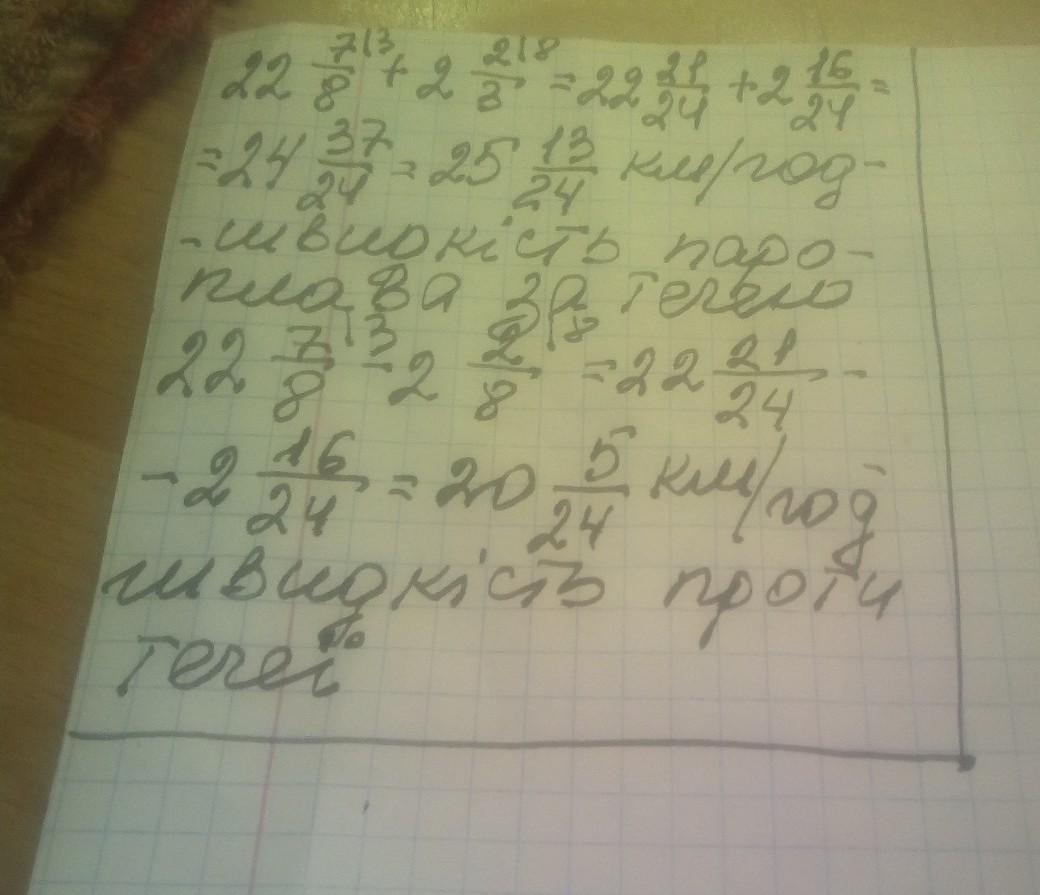 22 7/8 + 2 2/3= 183/8+8/3=(549+64)/24=613/24 = 25 13/24 км/год швидкість