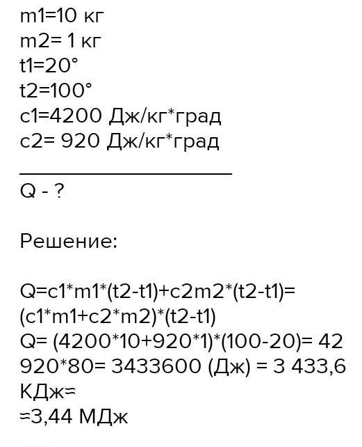 В алюминиевом чайнике массой 0,2 кг нагрели воду массой 1 кг от 20градусов С до кипения.Запишите формулу количества теплоты при теплообмене.2)Какое количество теплоты получил чайник в процессе нагревания?( удельная теплоёмкость алюминия 920Дж/кг градусов С)