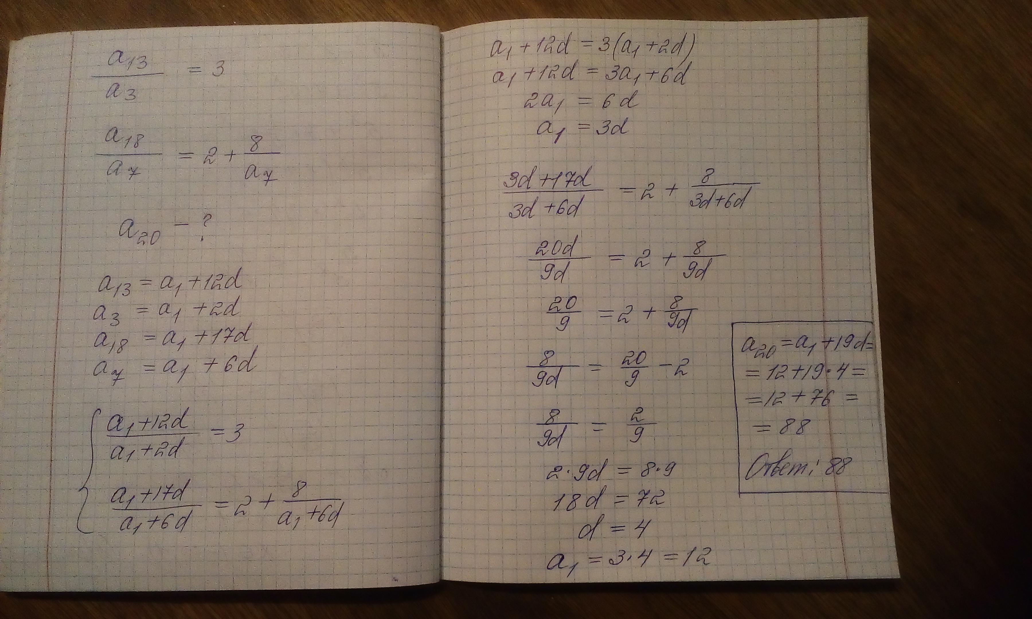 При делении 13-го члена арифметической прогрессии на ее 3-й член в частном получается 3, а при делении 18-го члена на 7-й в частном получается 2 и в остатке 8. Найти 20-й член прогрессии.