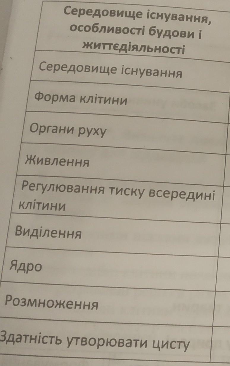 Порівняйте амебу протей і інфузорію-туфельку за цими параметрами: (будь ласка, даю 20 балів)