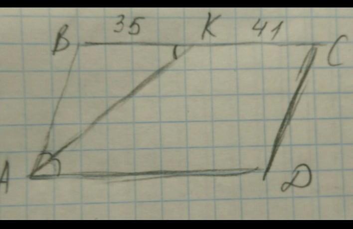 биссектриса острого угла параллелограмма делит его противоположную сторону на отрезки 35 см и 41 см считая от вершин