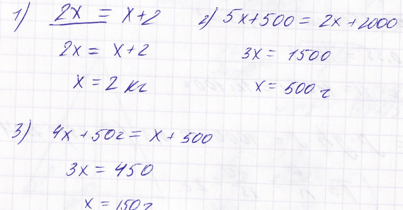 2)На левой чаше весов находится 5 кочанов капусты с одинаковой массой и гиря массой 500г, а на правой чаше - 2 кочана капусты и гиря массой 2 кг