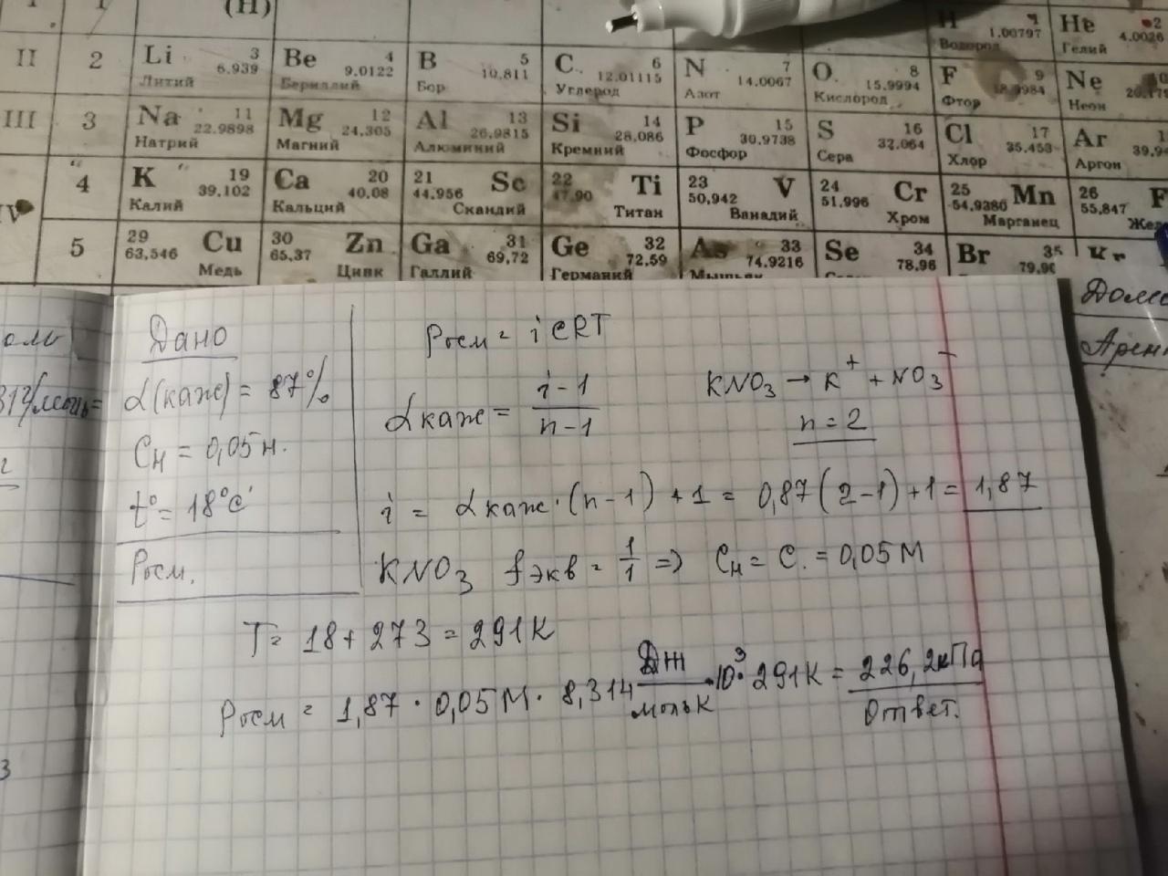 Кажущаяся степень диссоциации нитрата калия в 0,05 н. растворе равна 87%. Чему равно осмотическое давление этого раствора при 18 градусах С?