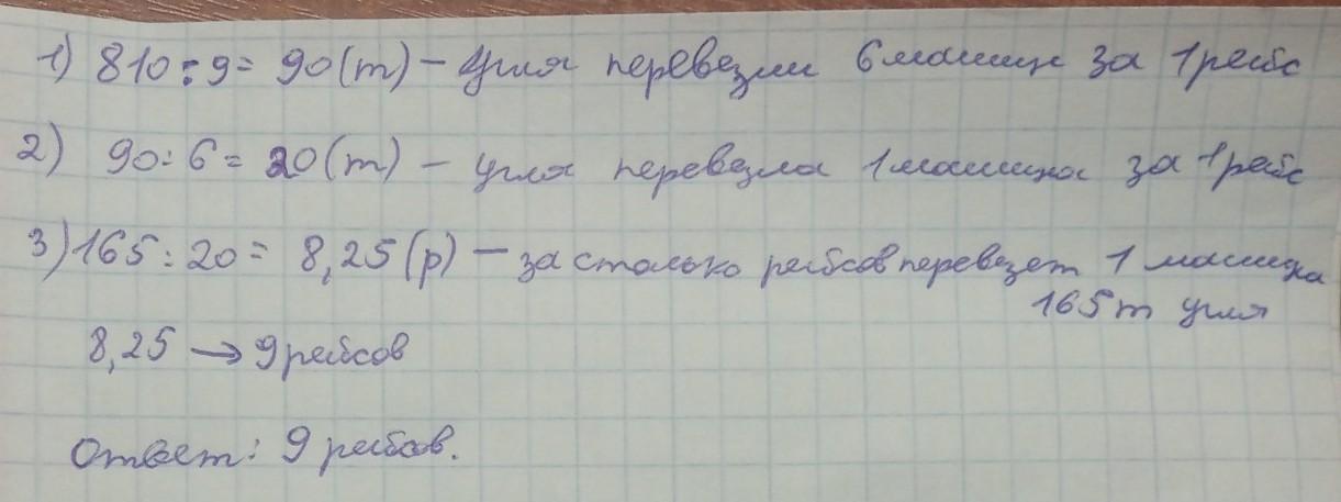 6 машин за 9 рейсів перевезли 810 т вугілля . За скільки рейсів можна перевезти 165 т вугілля однією машиною , якщо вантажність усіх машин однакова ?