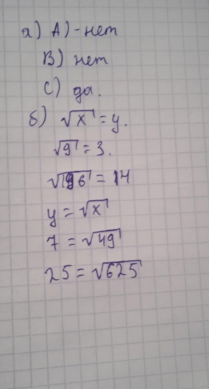 Дана функция у= √х.а) Проходит ли график этой функции через точки А (144; -12), В (0.8; 0.64), С(256; 16)?б) Какие значения будет принимать данная функция, если х [9; 196]в) Найдите значения аргумента, если у [7; 25]