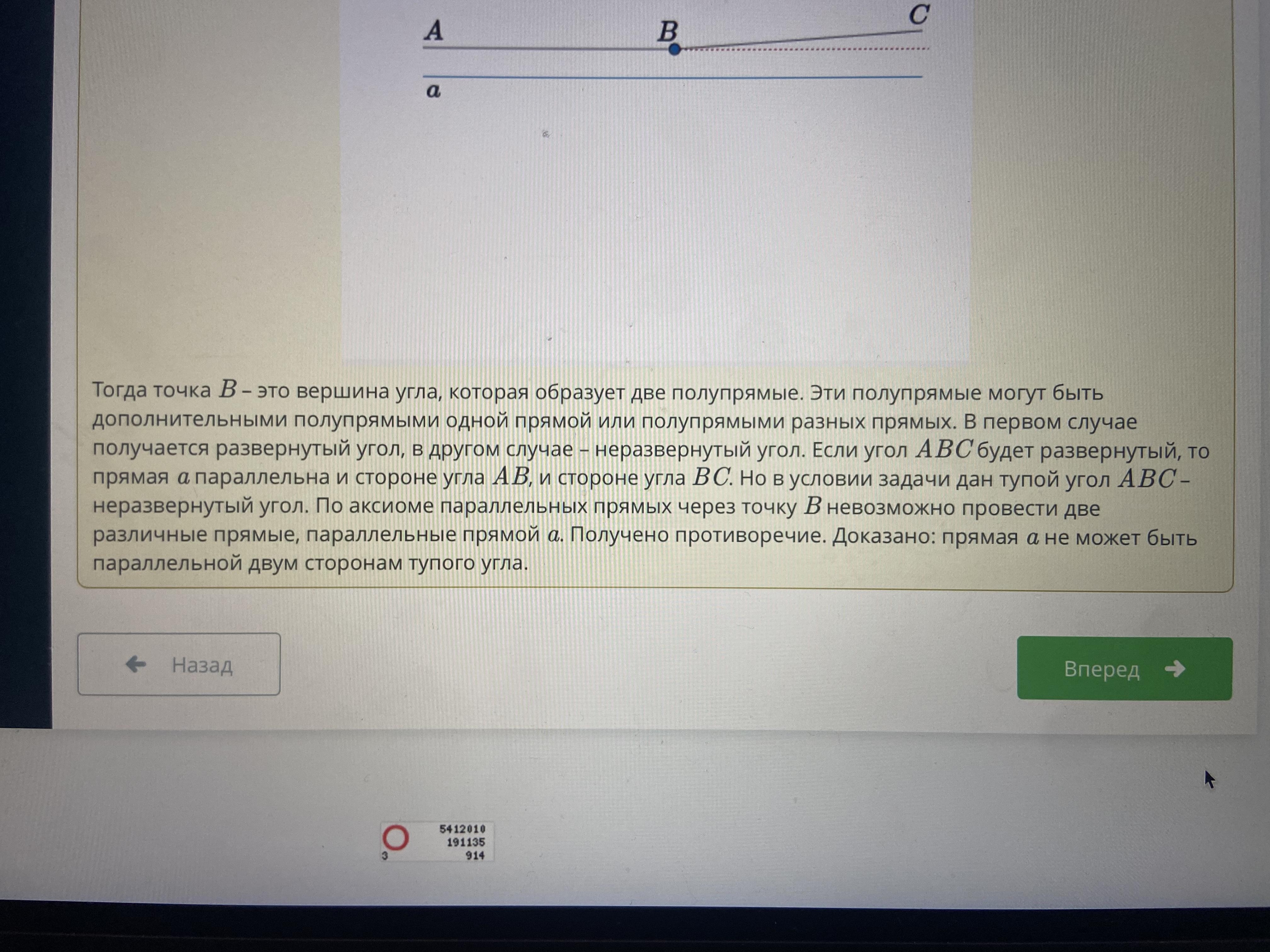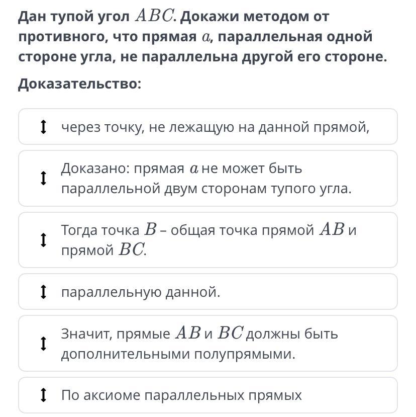 Дан тупой угол ABC. Докажи методом от противного, что прямая a, параллельная одной стороне угла, не параллельна другой его стороне.