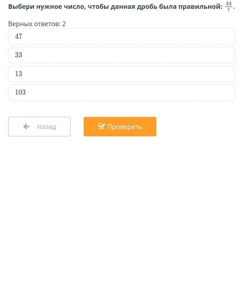 Для того, чтобы дробь была правильной, знаменатель должен быть больше числителя (больше 44):