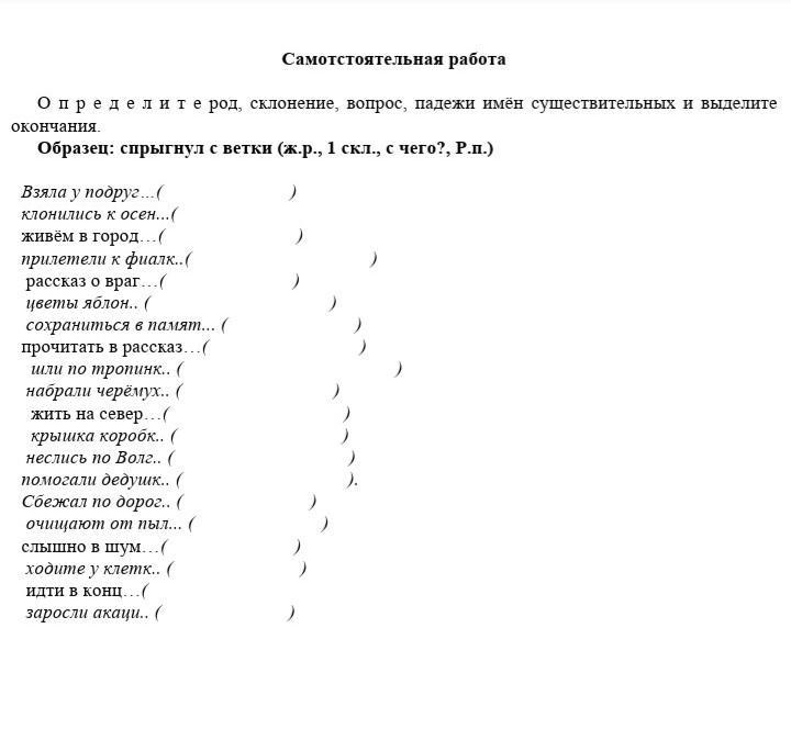 Взяла у подругИ (ж.р., 1 скл., у кого?, Р.п.), клонились к осенИ (ж.р., 3 скл., к чему?, Д.п), живёт в городЕ (м.р., 2 скл., в чём?, П.п.), прилетели к фиалкЕ (ж.р., 1 скл., к чему?, Д.п.), рассказ о врагЕ (м.р., 2 скл., о ком?, П.п.), цветы яблонИ (ж.р., 1 скл., чего?, Р.п.), сохраниться в памятИ (ж.р., 3 скл., в чём?, П.п.), прочитать в рассказЕ (м.р., 2 скл., в чём? П.п.), шли по тропинкЕ (ж.р., 1 скл., по чему?, Д.п.), набрали черёмухИ (ж.р., 1 скл., чего?, Р.п.), жить на северЕ (м.р., 2 скл., на чём?, П.п.), крышка коробкИ (ж.р., 1 скл., чего?, Р.п.), неслись по ВолгЕ (ж.р., 1 скл., по чему?, Д.п.), помогали дедушкЕ (м.р., 1 скл., кому?, Д.п.), сбежал по дорогЕ (ж.р., 1 скл., по чему?, Д.п.), очищают от пылИ (ж.р., 3 скл., от чего?, Р.п.), слышго в шумЕ (м.р., 2 скл., в чём?, П.п.), ходите у клеткИ (ж.р., 1 скл., у чего?, Р.п.), идти в концЕ (м.р., 2 скл., в чём?, П.п.), заросли акациИ (ж.р., 1 скл., чего?, Р.п.).
