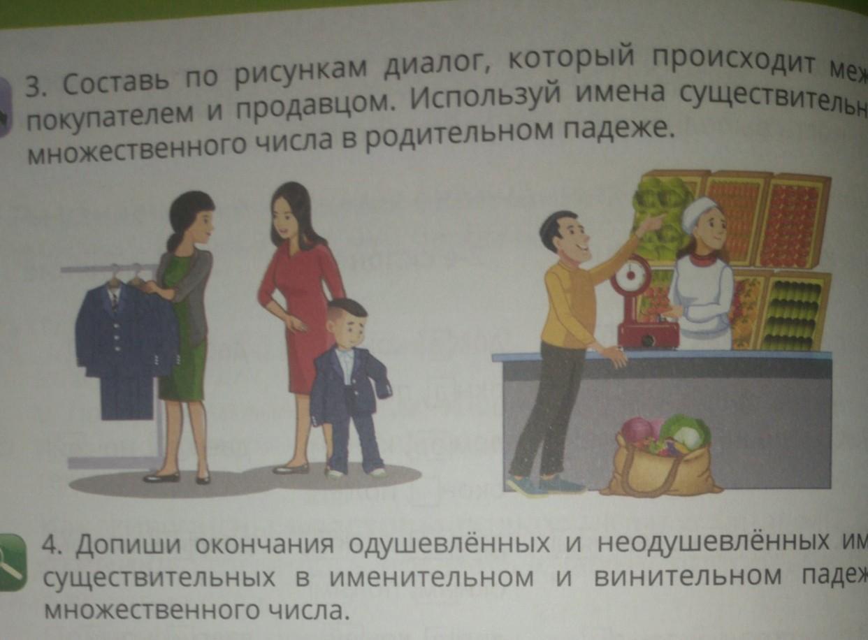 составь по рисункам диалог,который происходит между покупателем и продавцом.Используй имена существительные множественного числа в родительном падеже
