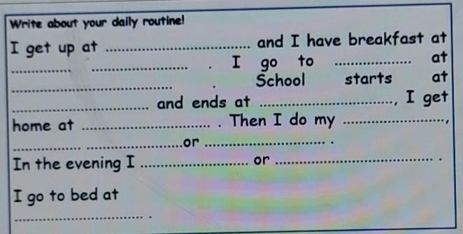 I get up at seven o'clock and I have breakfast at eight o'clock.I go to school at nine o'clock.School starts at ten o'clock and ends at two o'clock.I get home at two-half past.Then I do my homework at four or five o'clock.