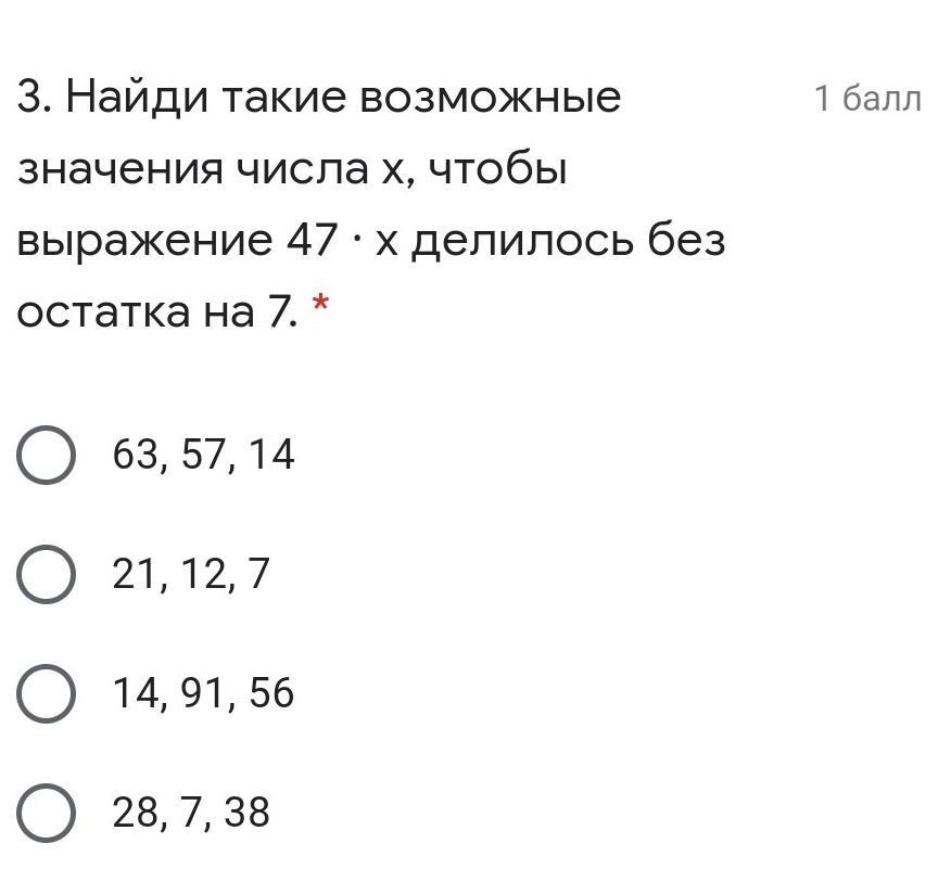 вариант ответа где числа 14, 91, 56. потому что они делятся все на 7.