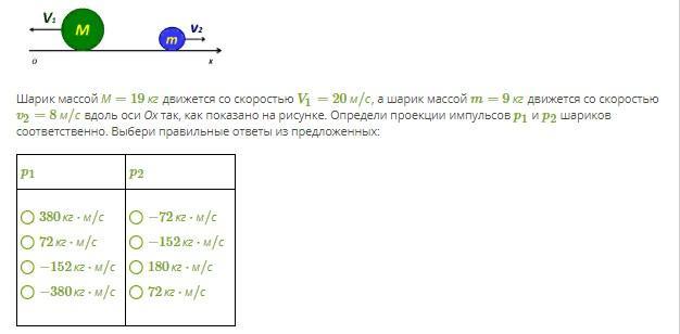 Шарик массой М = 19 кг движется со скоростью V1 = 20 м/с , а шарик массой m = 9 кг движется со скоростью v2 = 8 м/с вдоль оси Ох так, как показано на рисунке. Определи проекции импульсов p1 и p2 шариков соответственно. Выбери правильные ответы из предложенных:
