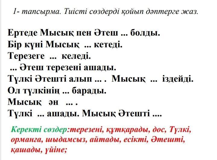 1.дос 2.орманға 3.түлкі 4.шыдамсыз 5.қашады 6.әтешті 7.үйіне 8.айтады 9.есікті 10. Құтқарады