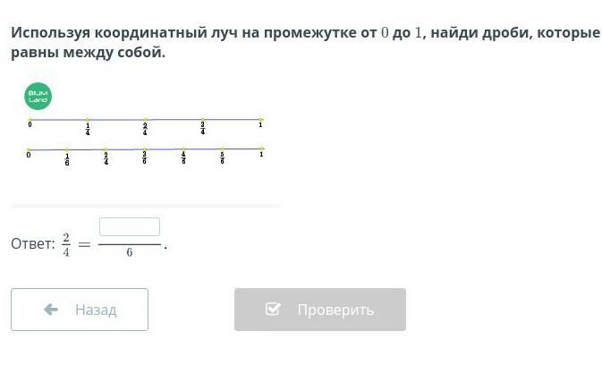 Используя координатный луч на промежутке от 0 до 1, найди дроби, которые равны между собой.