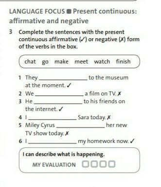 3 Complete the sentences with the present continuous affirmative (✓) or negative (X) form of the verbs in the box.