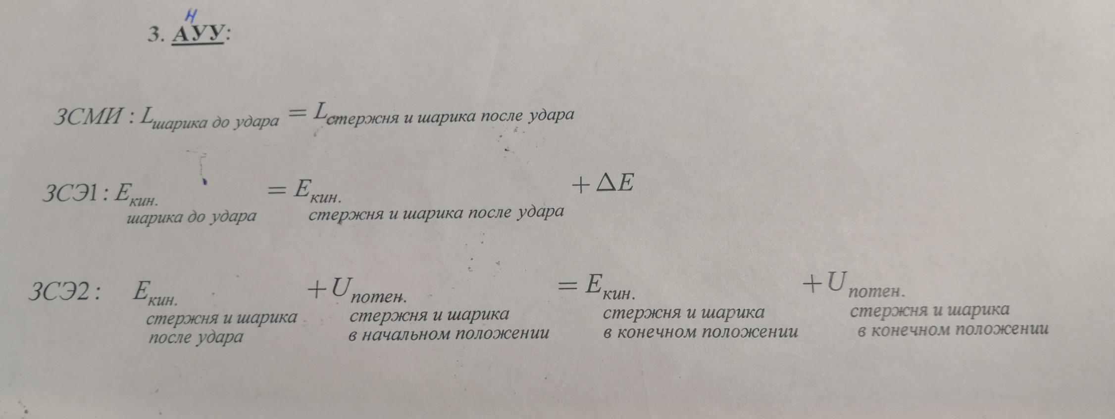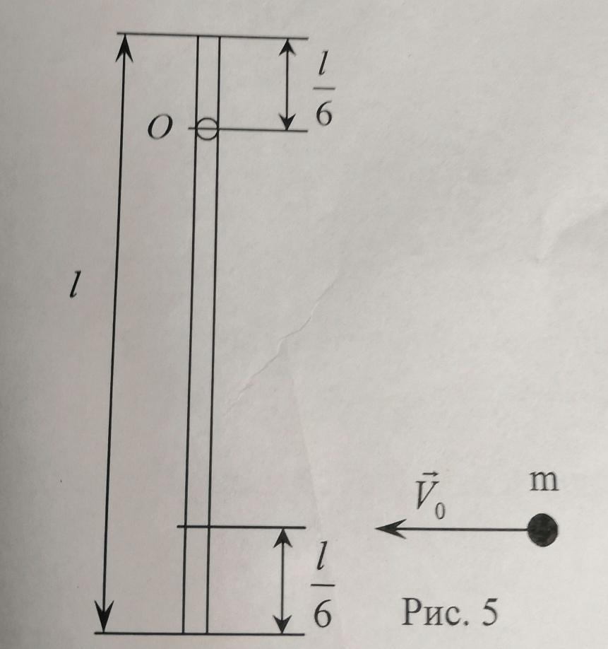 Жёсткий стержень длиной l =1 м и массой М= 1 кг свободно висит на горизонтальной идеально гладкой оси вращения О, как показано на рис. 5. Ось вращения перпендикулярна плоскости рисунка и ударяет в стержень. Задано: V0 = 0,5 V0m ; V0m =1 м/с. Определить : угол аm и дельта Е.