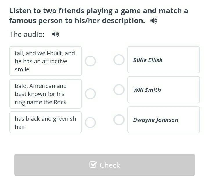 Listen to two friends playing a game and match a famous person to his/her description.