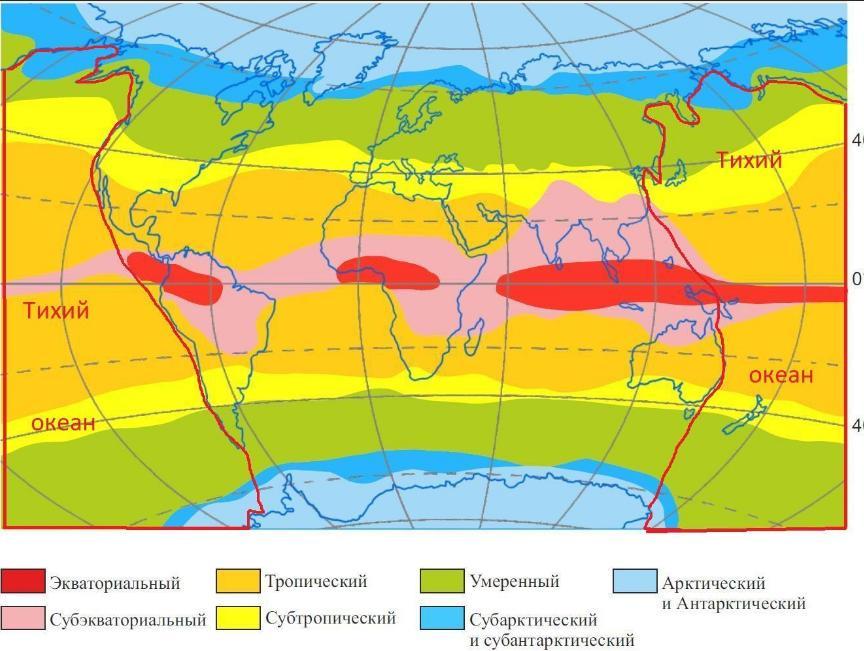 Как видно из карты, которая дана ниже в приложении, экваториальный пояс не идёт сплошной полосой около экватора.Он расположен в Африке от Гвинейского залива и до озера Виктория, занимает всю долину реки Конго, в Южной Америке в районе реки Амазонка, а также захватывает Индонезийские острова и полуостров Малакка.Этот пояс расположен между 10° северной и южной широты.