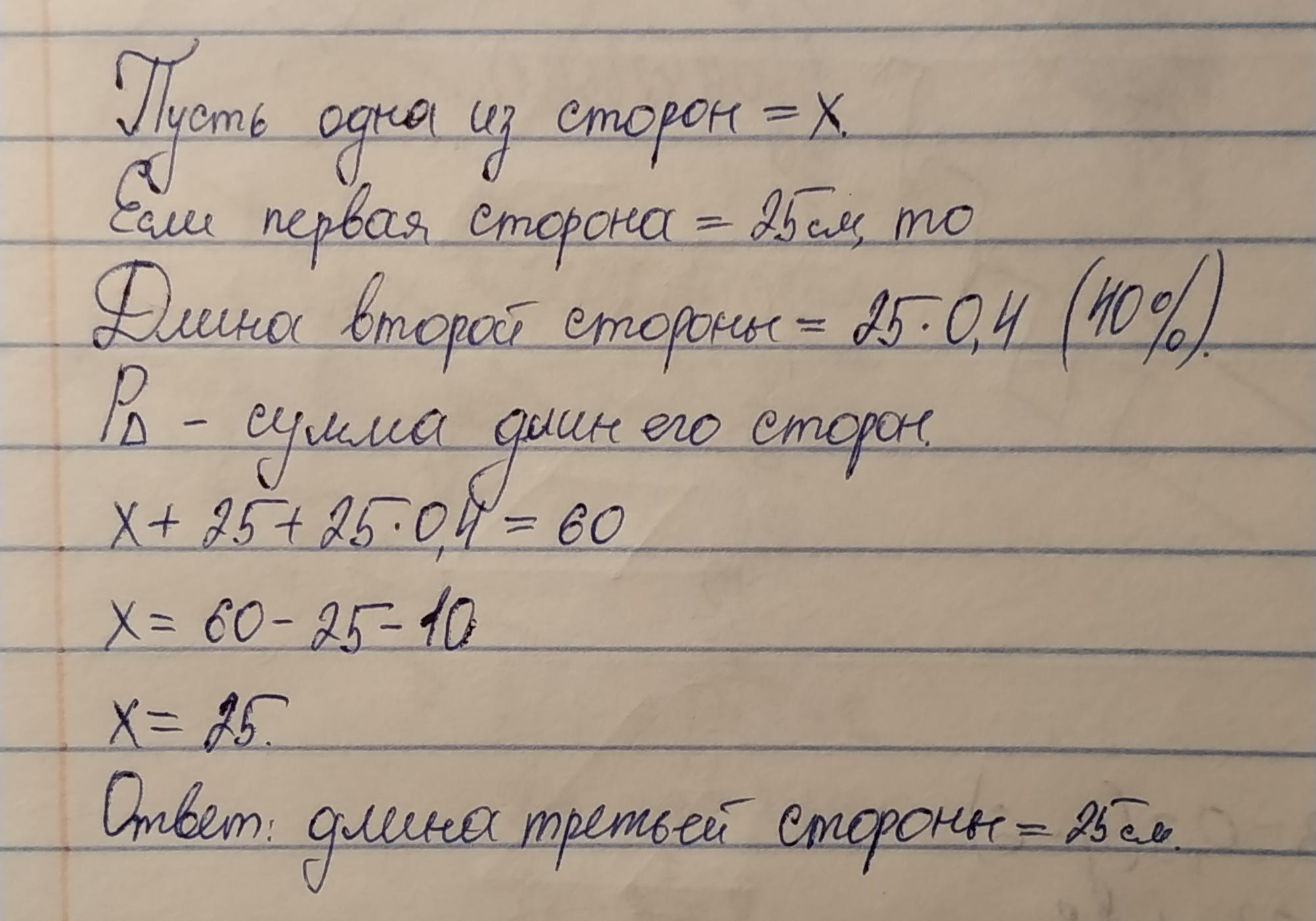 Периметр треугольника равен 60 см. Одна из сторон равна 25 см, длина второй стороны составляет 40% от длины первой стороны. Найдите длину третьей стороны.
